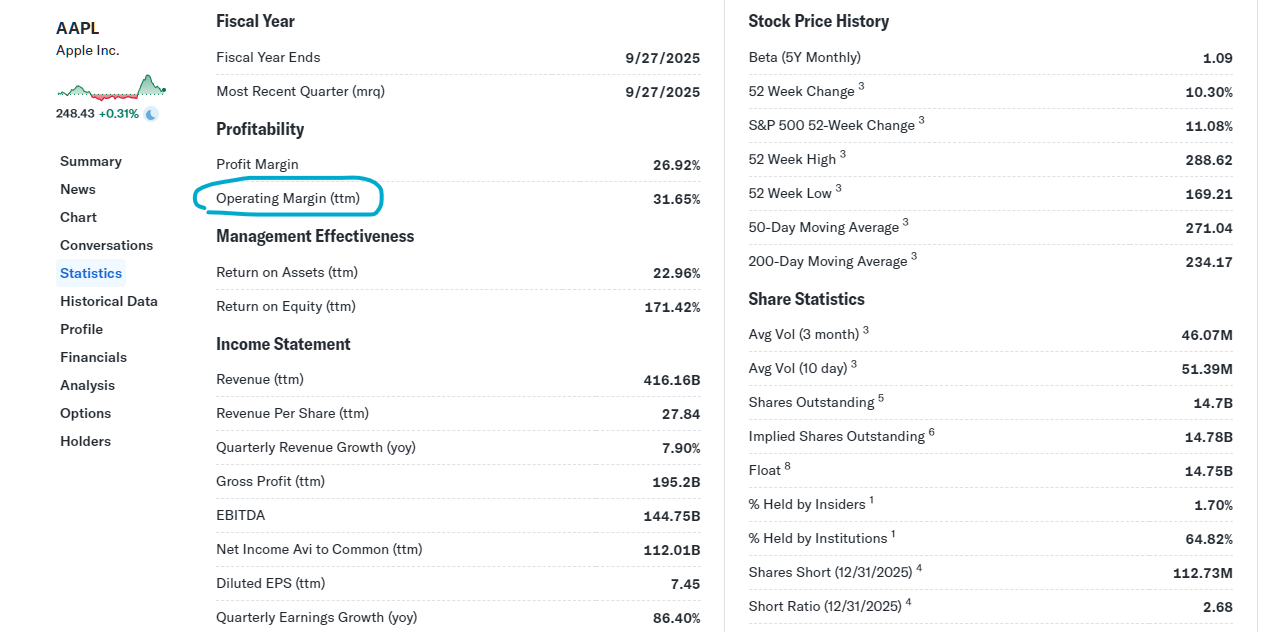 Yahoo Finance에서는 Statistics를 클릭한 후 밑으로 내려보면 Operating Margin이 %로 나옵니다.